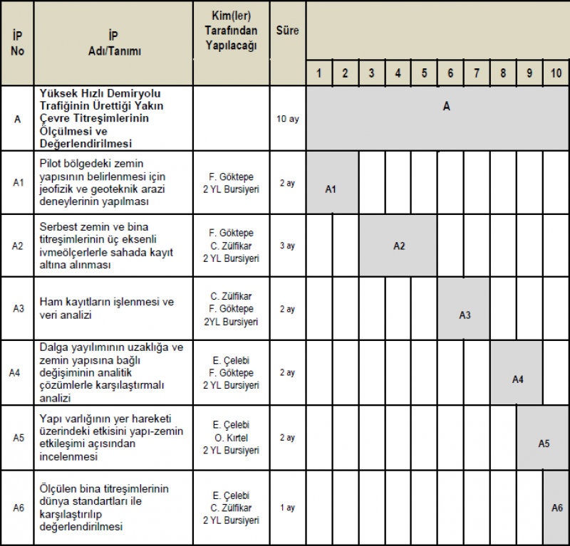 Hazırlanan bu rapor çalışmasının bu kısmında, yolcu ve yük taşımacılığında kullanılan farklı hızlardaki tren geçişlerinin alüvyon zemin ortamında sebep olduğu çevresel titreşim etkileri sebebiyle, titreşim oluşum mekanizmasının ve dalga yayılım özelliklerinin belirlenmesine odaklanılmıştır. Bu amaçla, İstanbul-Ankara arasında toplam uzunluğu 533 km ve taşıma gücü zayıf zemin ortamlarından geçen Köseköy-Pamukova arasındaki yüksek hızlı modern demiryolu hattındaki farklı frekans içeriklerine sahip tekrarlı tren geçişleri dikkate alınmıştır. YHT ile yük ve banliyö trenlerinin geçişleri esnasında demiryolu üstyapısının yakın çevresinde meydana gelen titreşim etkilerinin yerinde incelenebilmesi için ölçüm sahası olarak İzmit-Arifiye arasında bulunan Kırkpınar bölgesi seçilmiştir. Dinamik yük kaynağından farklı mesafelerde demiryolu hattına dik doğrultuda serbest zemin yüzeyine yerleştirilen ivmeölçerler vasıtasıyla alınan veriler filtreleme programları kullanılarak ivme genlik değerleri elde edilmiştir. Bornitz’ in iki nokta arasındaki titreşim enerji soğurulmasına bağlı analitik çözüm sonuçları ile sismik testlerden elde edilen deneysel veriler arasındaki azalım ilişkisi mesafeye bağlı olarak elde edilmiştir.